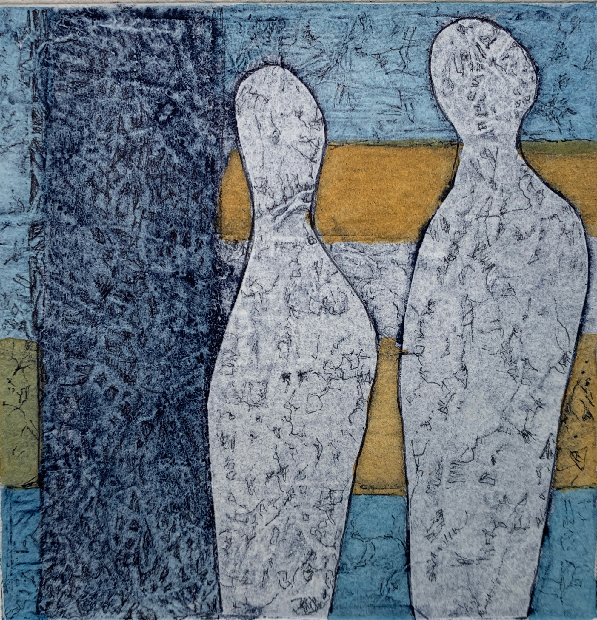 I work mainly with semi-abstracted and expressive figuration and landscape using mixed media, paint, fabric and ink, collage and collagraph printing.
